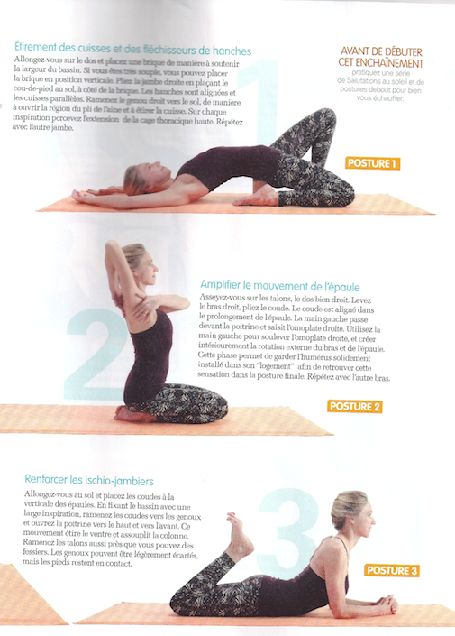 Lying on the back we lift the hips up and place a yoga block under the pelvis in a way that supports the width of the body. It’s best to start with the block on its shortest side however, for those already quite flexible it can be placed on its higher side. Once the block is in position, we fold one leg back so that the top of the foot is on the floor to the side of the block. With mindfulness we ensure that the hip bones are the same level, the thigh bones are parallel and then we can start to reach the knee down and away to bring more lengthening to the front of the leg and hip. Then we can unfold the leg and work with the other leg.